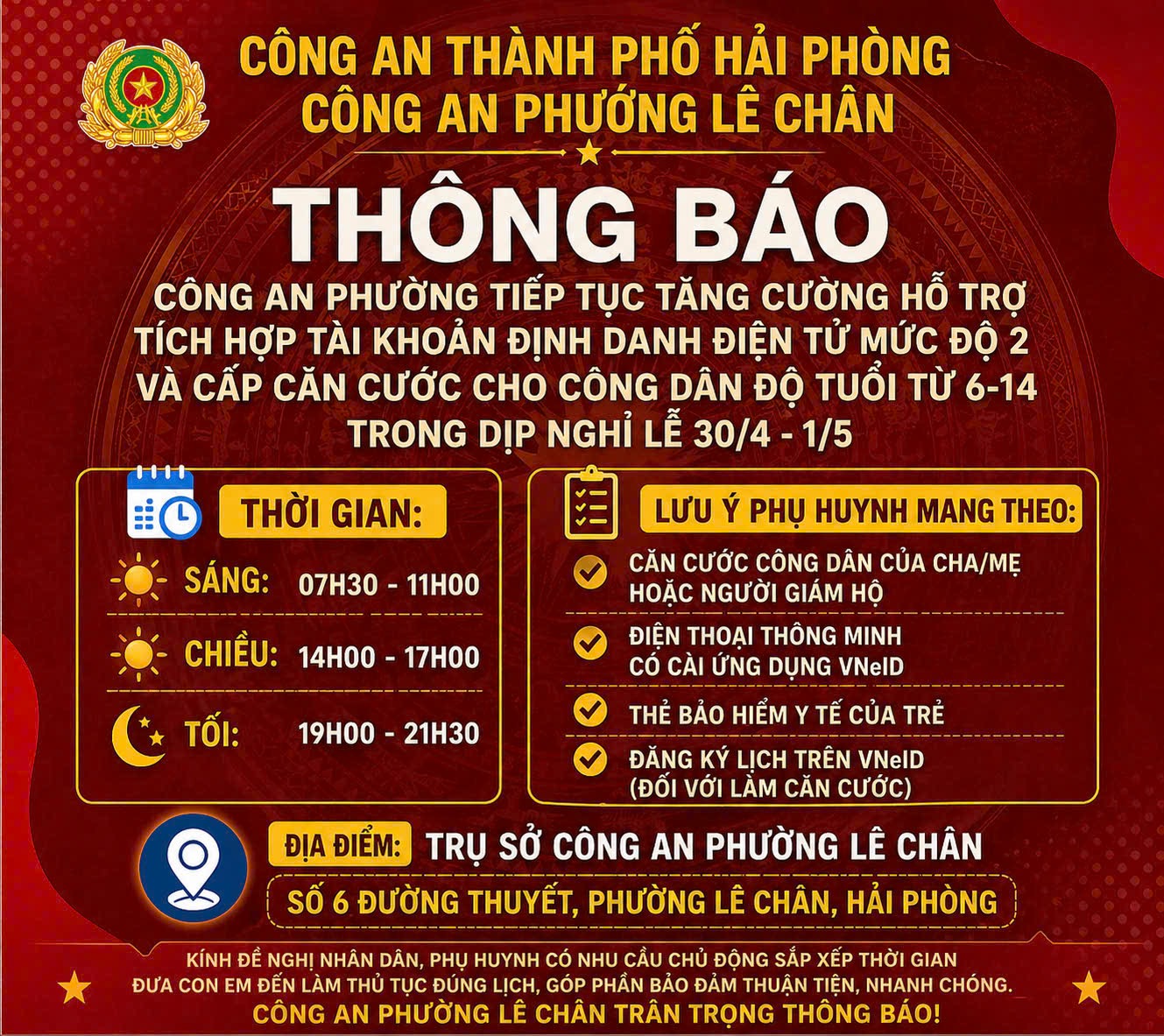CÔNG AN PHƯỜNG LÊ CHÂN TĂNG CƯỜNG HỖ TRỢ ĐỊNH DANH ĐIỆN TỬ MỨC ĐỘ 2 VÀ CẤP CĂN CƯỚC CHO TRẺ TỪ 6–14 TUỔI TRONG DỊP NGHỈ LỄ 30/4 – 1/5