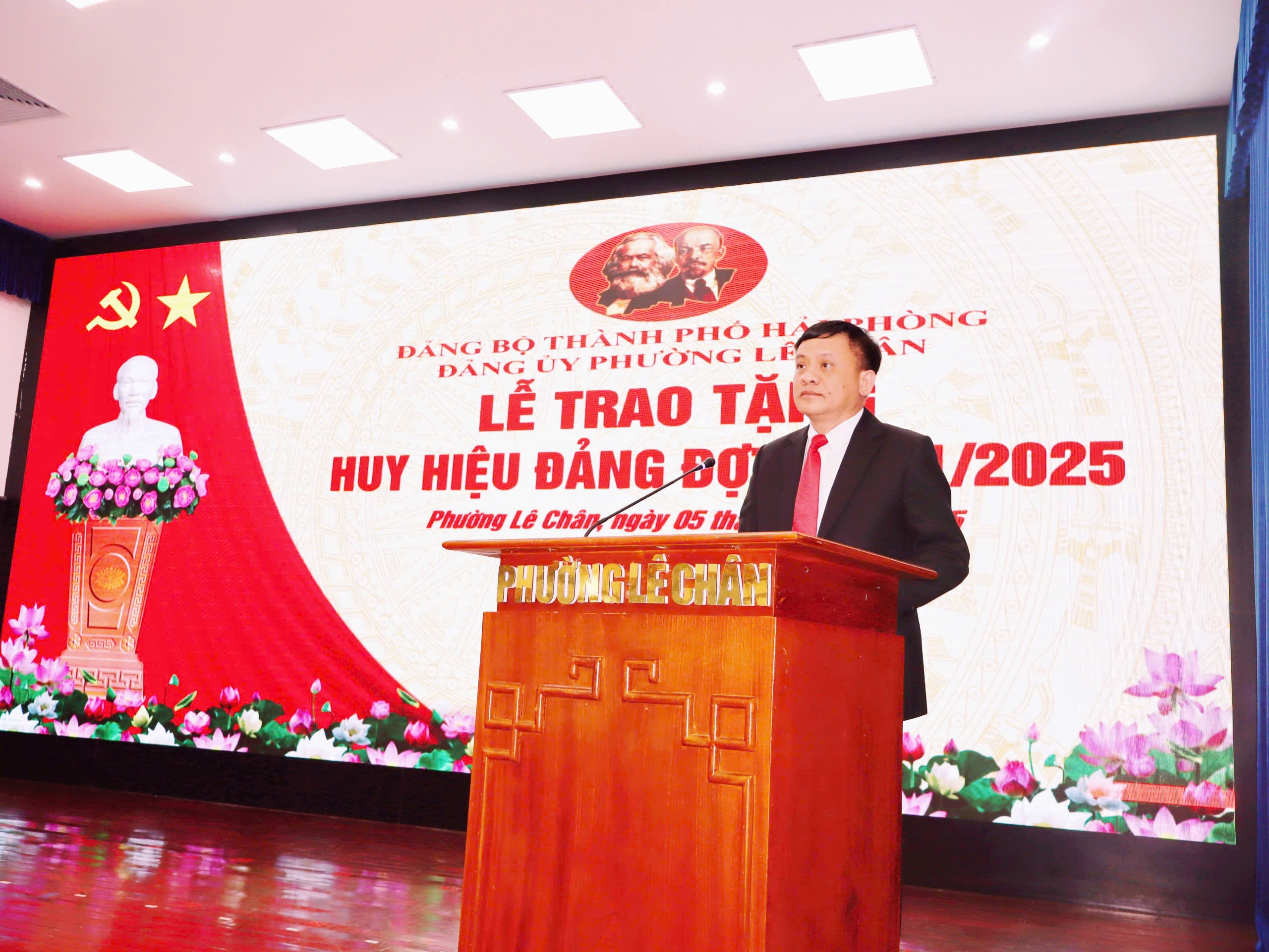 Phát biểu tại buổi lễ, đồng chí Đặng Đông Anh ghi nhận những cống hiến của các đồng chí Đảng viên được trao Huy hiệu Đảng trong đợt này, nhấn mạnh rằng Huy hiệu Đảng không chỉ là phần thưởng cao quý dành cho mỗi cá nhân mà còn là niềm tự hào của toàn Đảng bộ phường Lê Chân. Đồng chí mong muốn các Đảng viên tiếp tục phát huy vai trò hạt nhân, là tấm gương sáng trong xây dựng hệ thống chính trị, củng cố nền tảng tư tưởng của Đảng, góp phần đưa phường Lê Chân ngày càng phát triển văn minh, hiện đại.