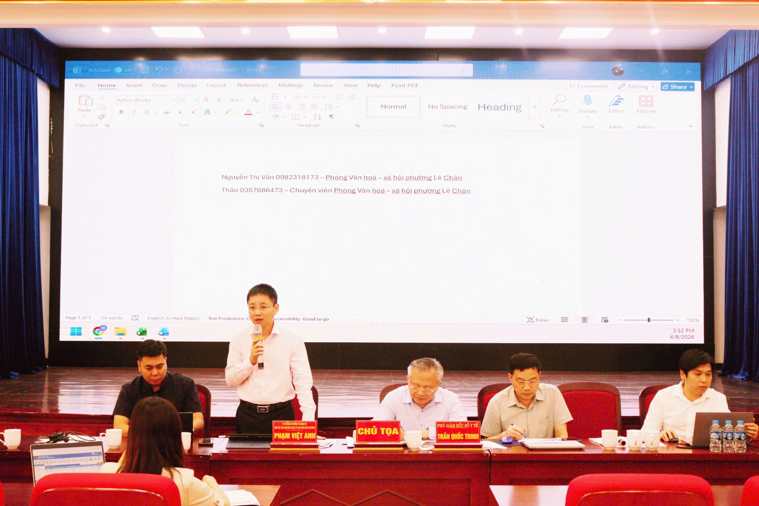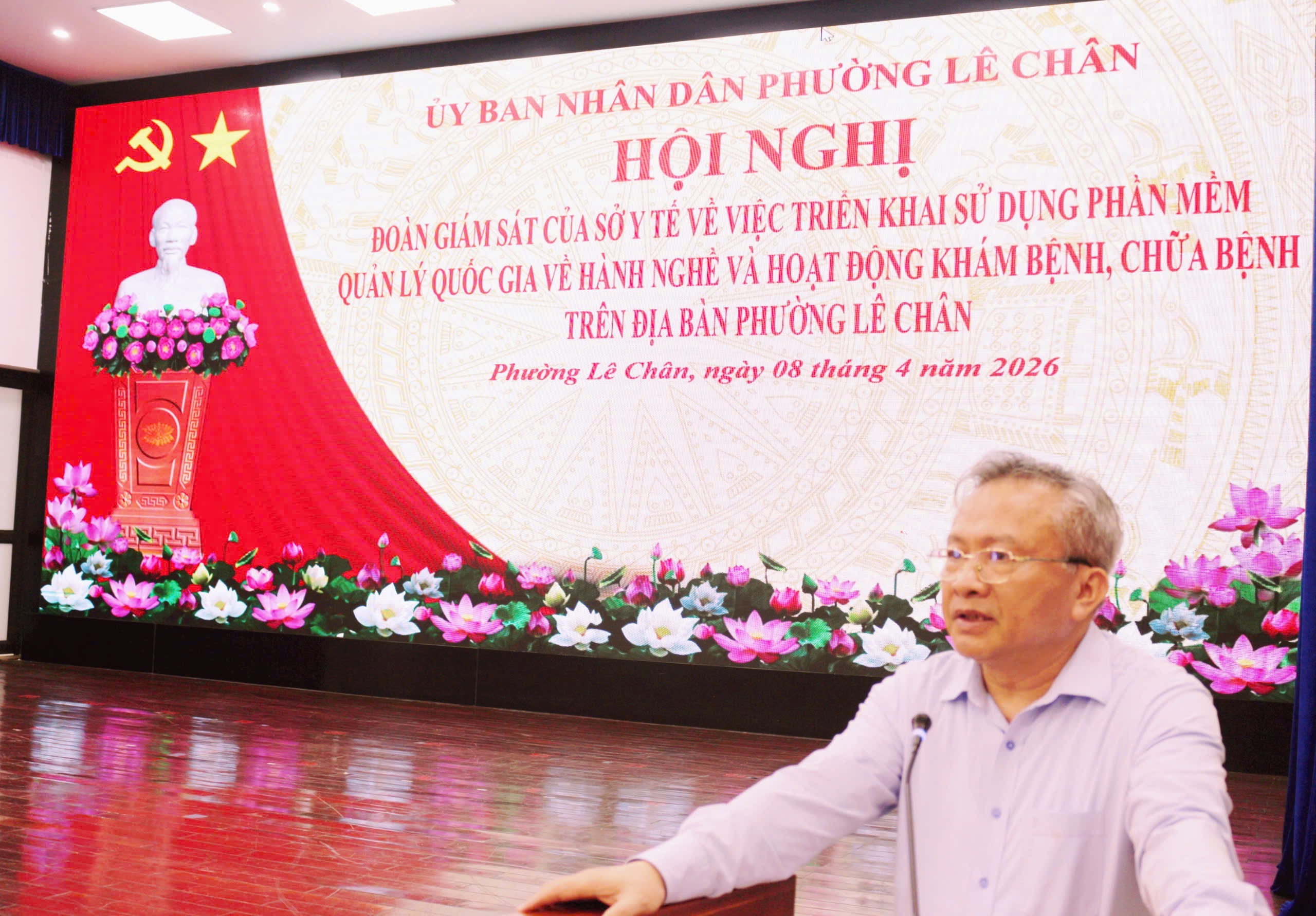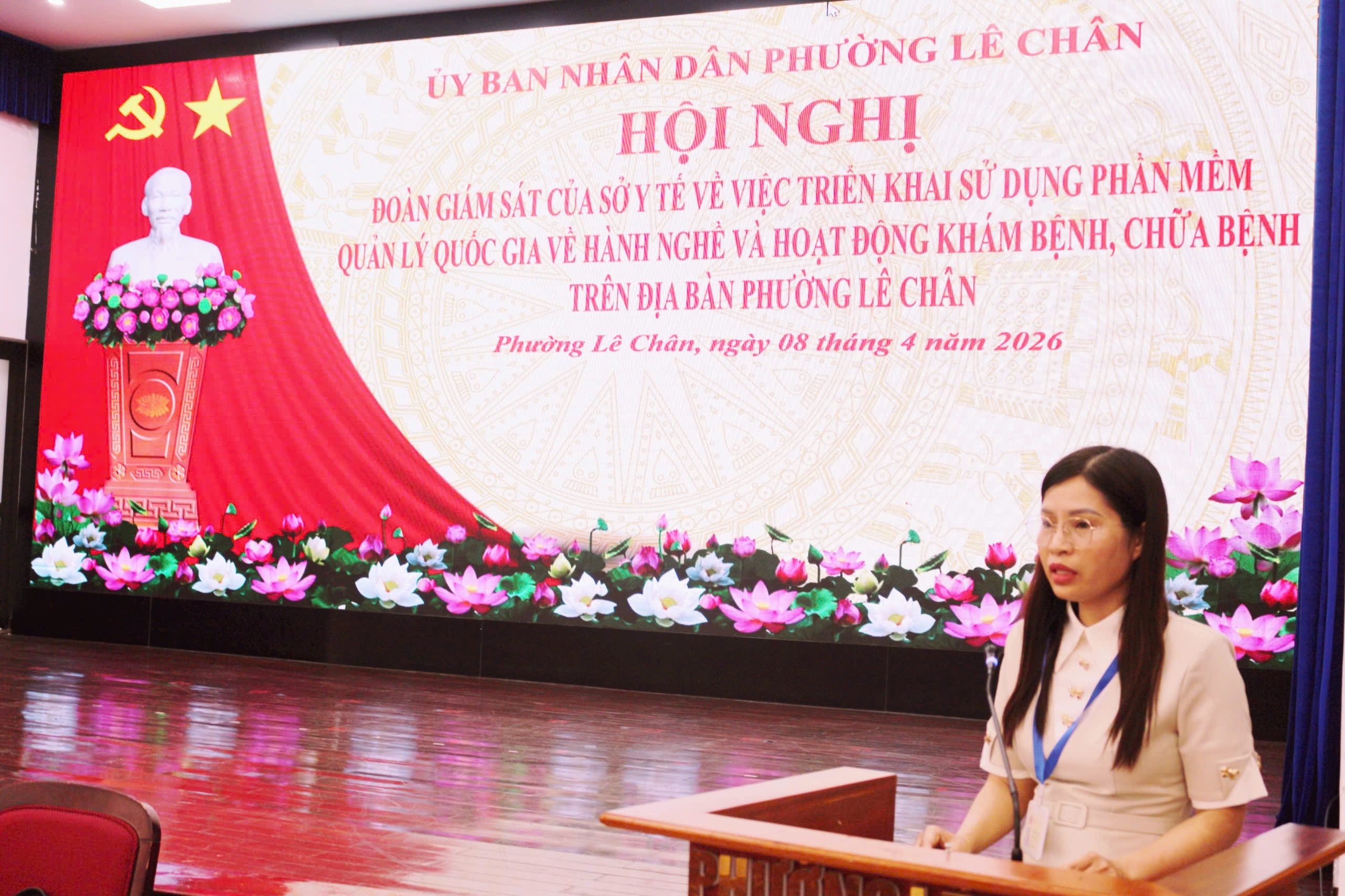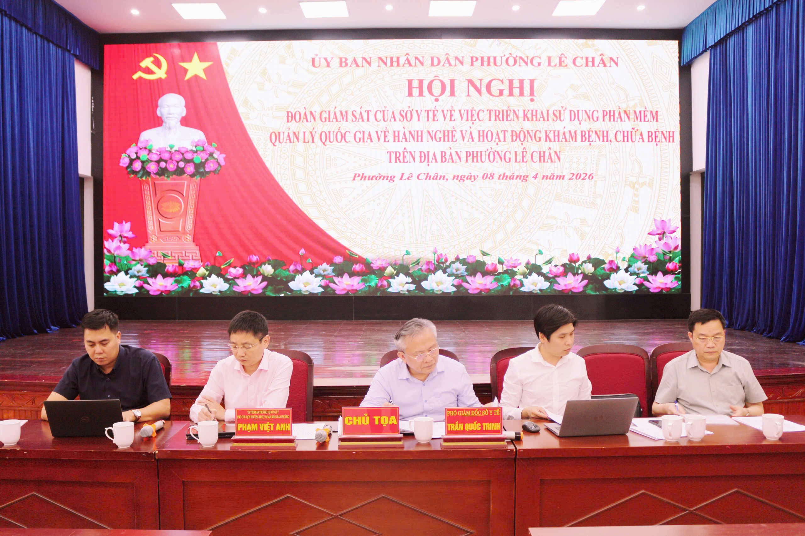 Chiều ngày 08/4/2026, tại Hội trường Đảng ủy, Đoàn công tác Sở Y tế thành phố do đồng chí Trần Quốc Trinh – Phó Giám đốc Sở Y tế làm Trưởng đoàn đã tiến hành giám sát việc triển khai Hệ thống Quản lý quốc gia về hành nghề và hoạt động khám bệnh, chữa bệnh trên địa bàn phường Lê Chân.