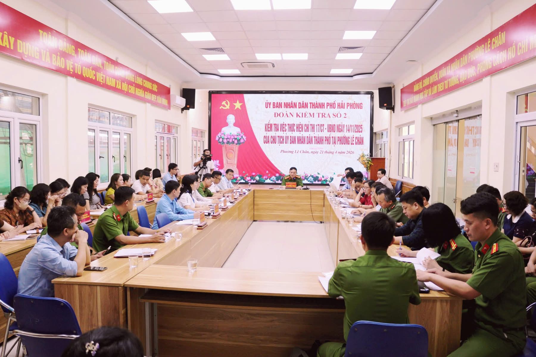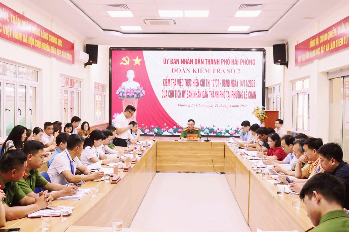 Sáng ngày 21/4/2026, Đoàn kiểm tra số 2 của thành phố do đồng chí Thượng tá Vũ Dương Tường – Trưởng phòng PC06 Công an thành phố, Trưởng đoàn kiểm tra, cùng đại diện các sở, ban, ngành đã tiến hành kiểm tra việc thực hiện Chỉ thị số 17/CT-UBND ngày 14/11/2025 của UBND thành phố Hải Phòng về tăng cường bảo đảm trật tự công cộng, trật tự đô thị, trật tự đường hè và hành lang an toàn giao thông trên địa bàn, trong đó có phường Lê Chân.