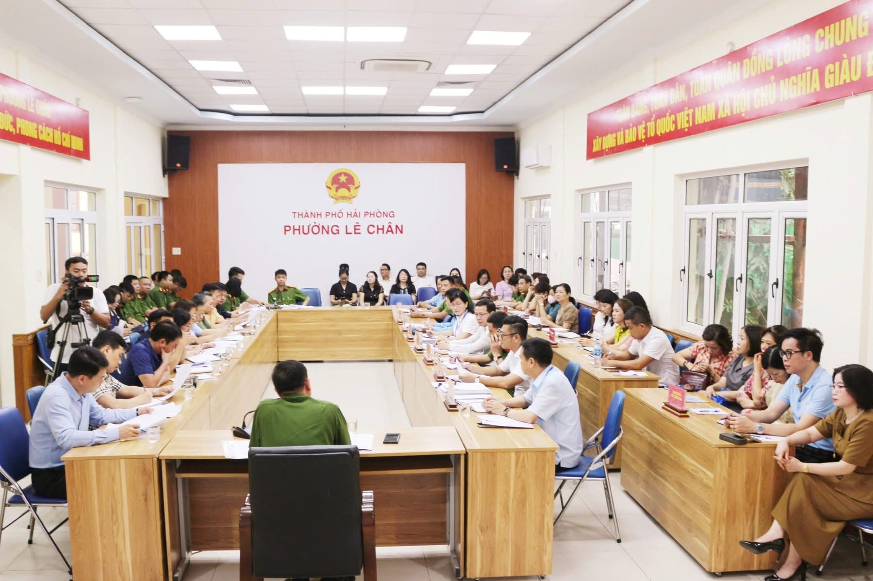 Làm việc với Đoàn, về phía phường Lê Chân có đồng chí Phạm Văn Tân – Phó Bí thư Đảng ủy, Chủ tịch UBND phường; các đồng chí Phó Chủ tịch UBND phường; lãnh đạo các phòng, ban, đơn vị; lực lượng Công an và Ban Giám hiệu các trường học trên địa bàn.