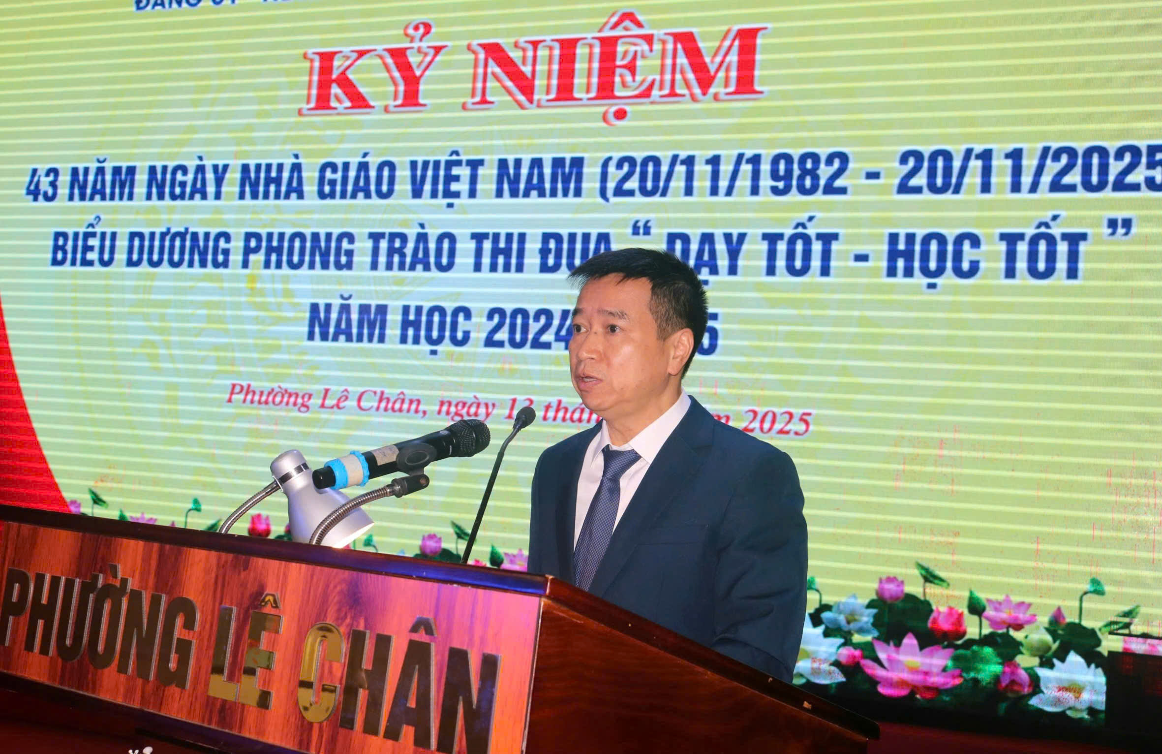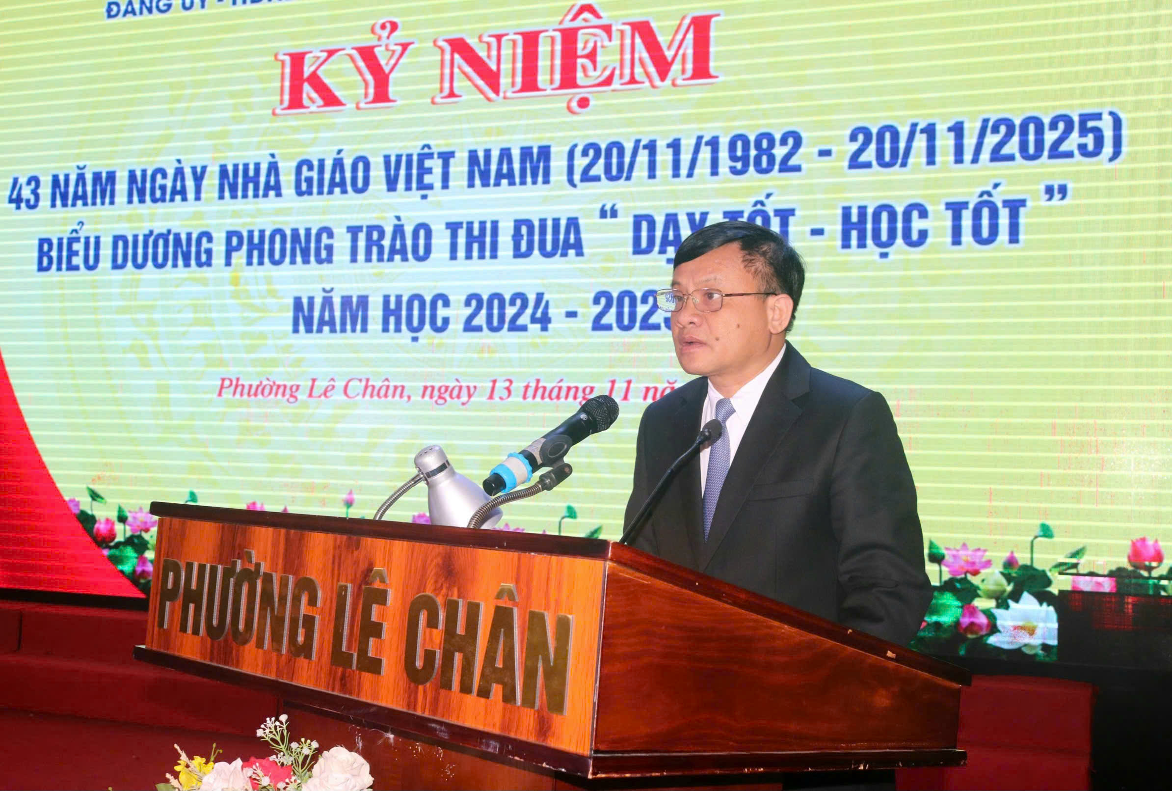 Tại buổi lễ, đồng chí Đặng Đông Anh – Ủy viên Thành ủy, Bí thư Đảng ủy phường phát biểu, bày tỏ niềm tự hào về truyền thống hiếu học và tinh thần đổi mới của giáo dục phường Lê Chân. Đồng chí nhấn mạnh: “Người thầy giữ vị trí trung tâm trong công cuộc đổi mới giáo dục; là người truyền lửa, khai tâm mở trí, gieo mầm tương lai cho lớp lớp học trò. Đảng ủy phường tin tưởng rằng, với tinh thần đoàn kết, sáng tạo và trách nhiệm, đội ngũ nhà giáo Lê Chân sẽ tiếp tục khẳng định vai trò nòng cốt, góp phần xây dựng nền giáo dục tiên tiến, nhân văn và hội nhập.”