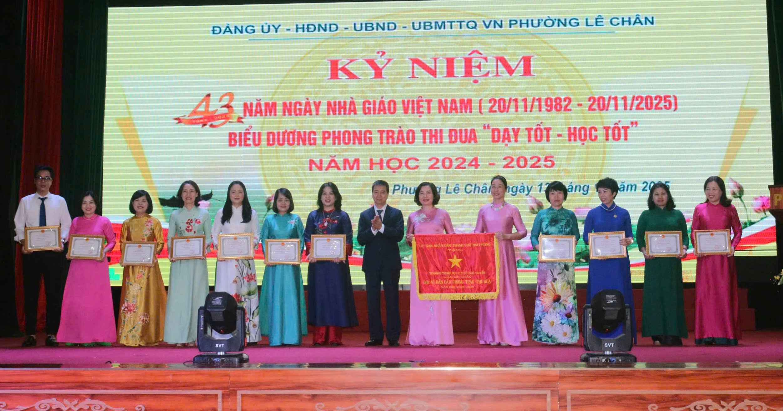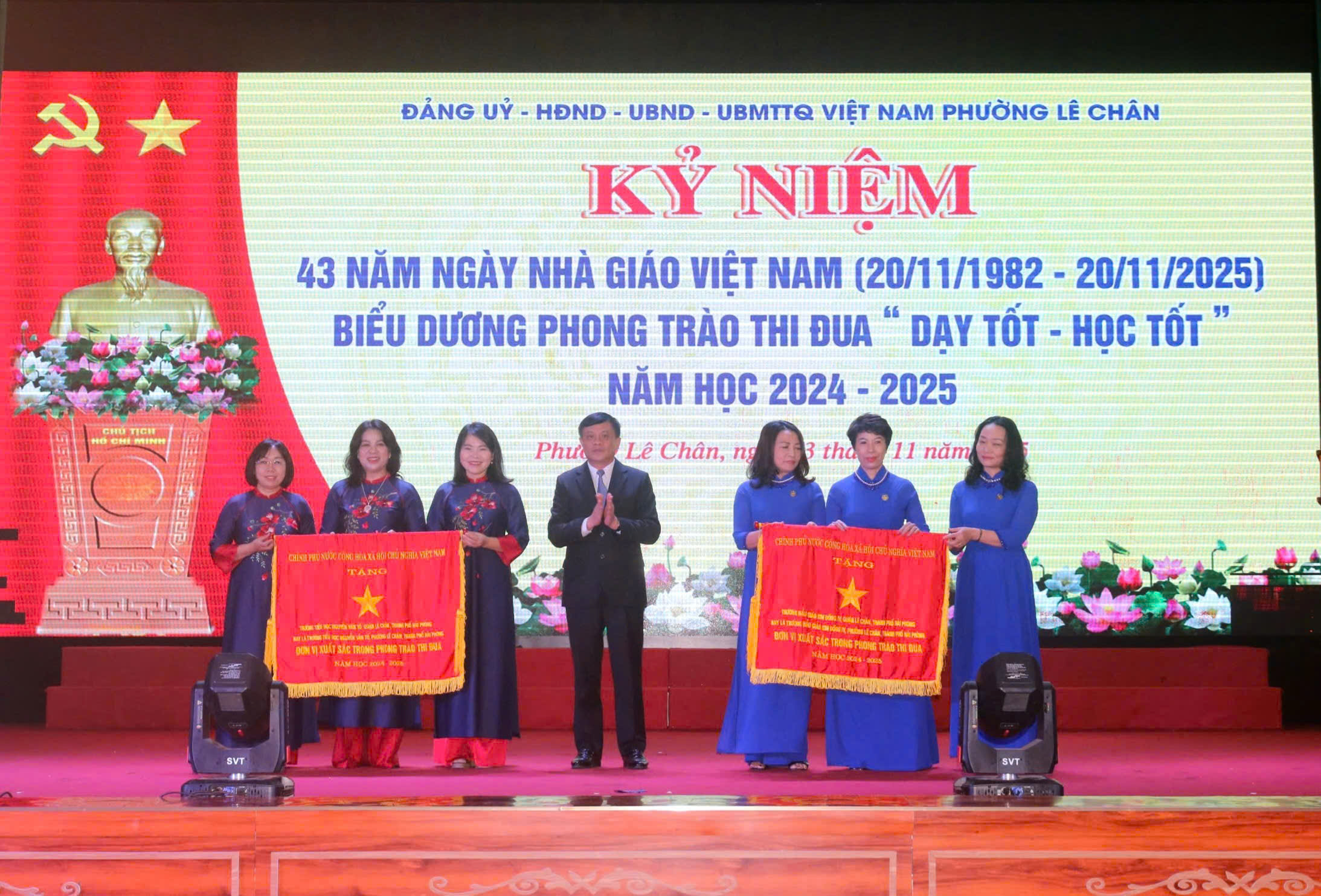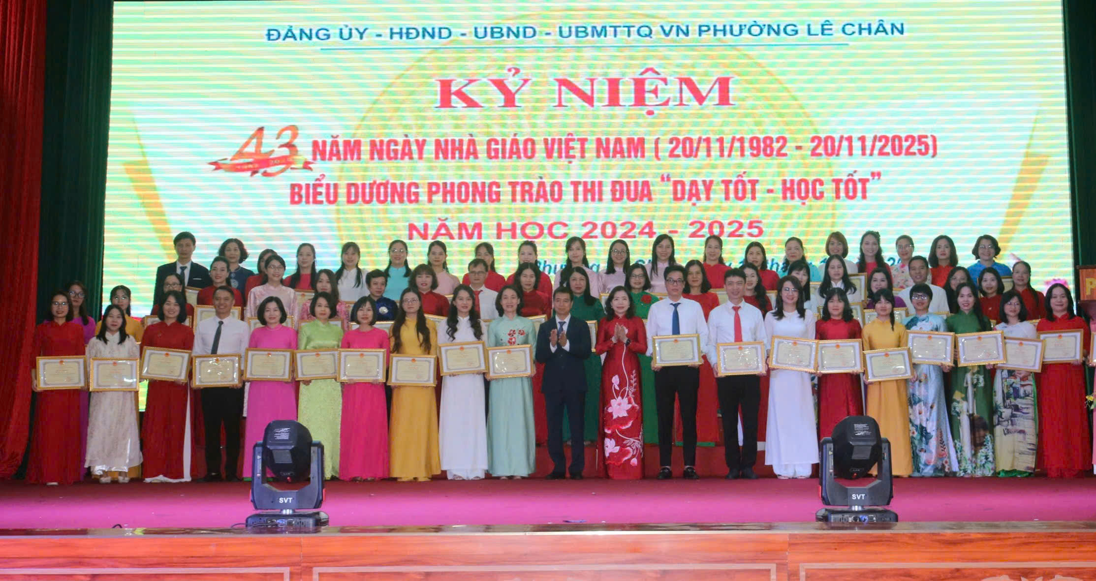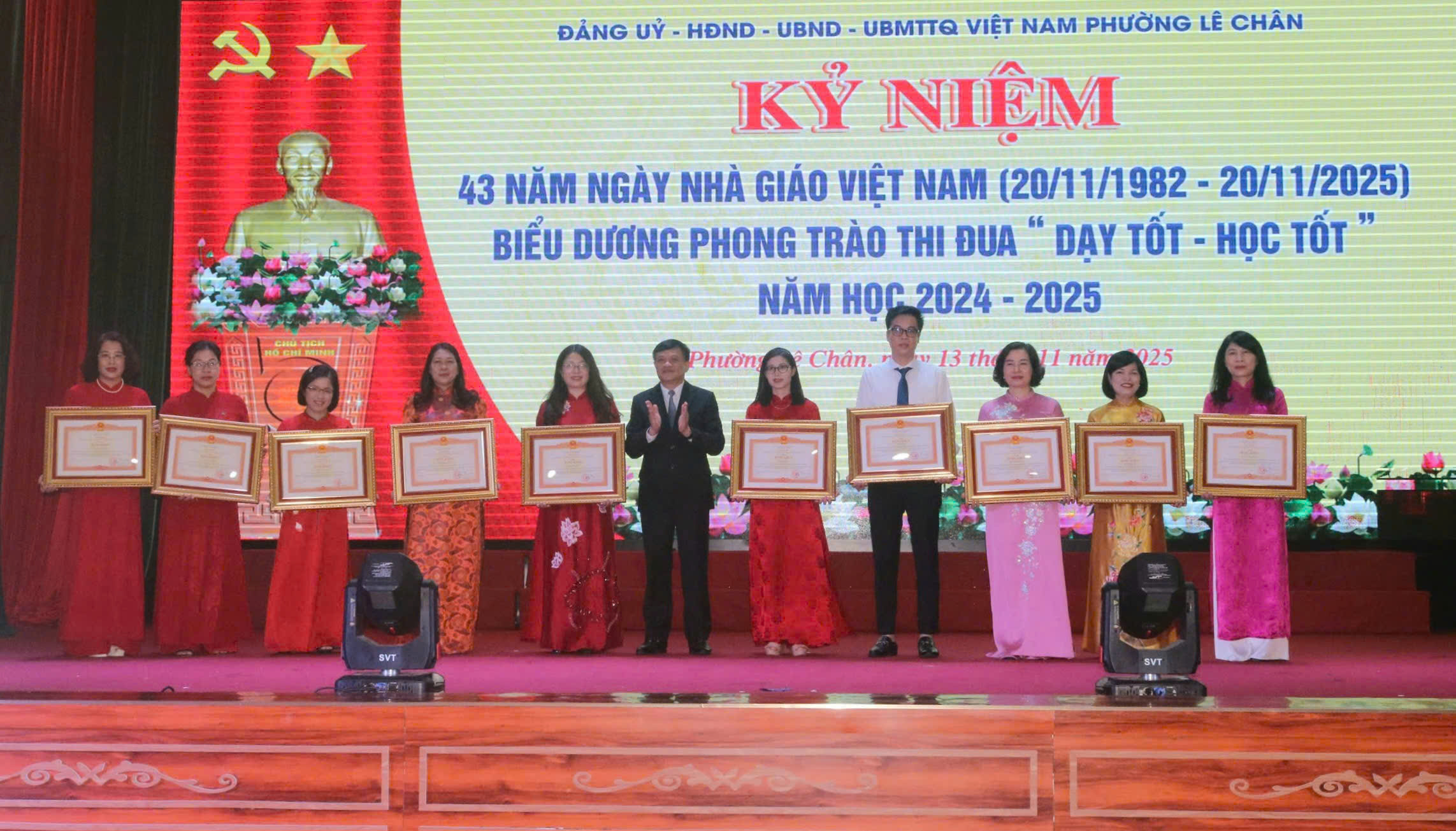 Sáng ngày 13/11/2025, tại Trung tâm Sự nghiệp công phường Lê Chân, Đảng ủy – Hội đồng nhân dân – Ủy ban nhân dân – Ủy ban Mặt trận Tổ quốc Việt Nam phường Lê Chân long trọng tổ chức Lễ kỷ niệm 43 năm Ngày Nhà giáo Việt Nam (20/11/1982 - 20/11/2025) và biểu dương phong trào thi đua “Dạy tốt - Học tốt” năm học 2024 - 2025.