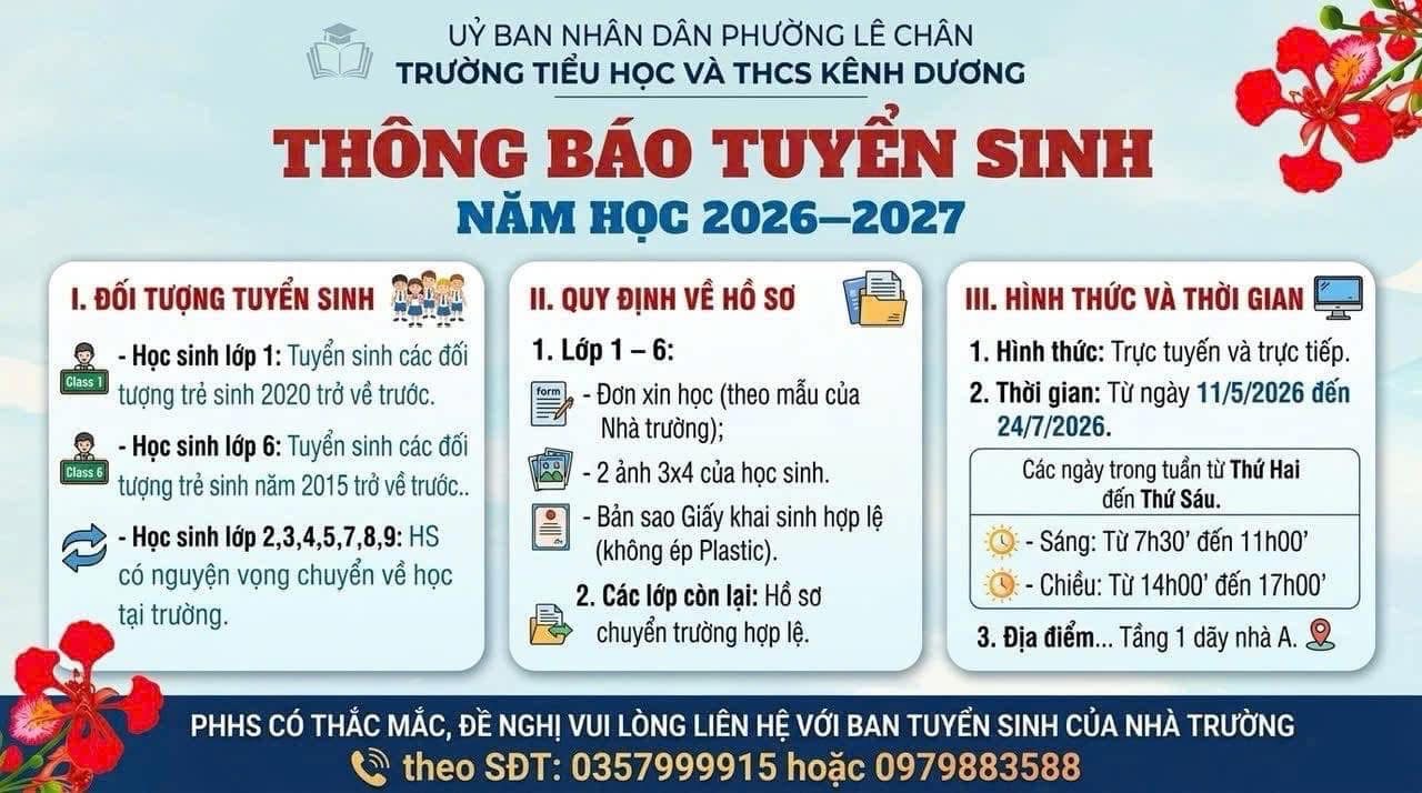 Năm học 2026–2027, Trường Tiểu học và Trung học cơ sở Kênh Dương (phường Lê Chân) thông báo tuyển sinh các khối lớp, đáp ứng nhu cầu học tập của học sinh trên địa bàn và các trường hợp có nguyện vọng chuyển trường.