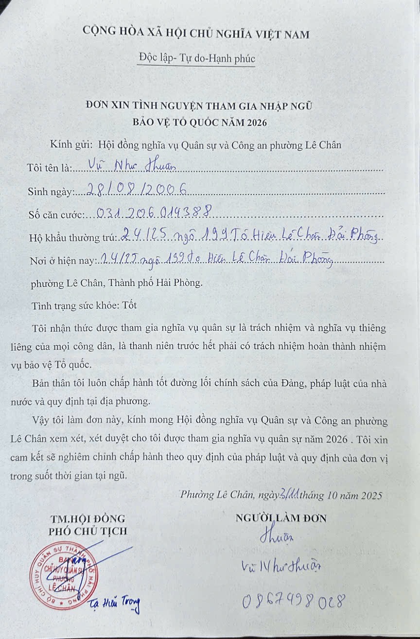 Phát huy truyền thống quê hương anh hùng, thanh niên Vũ Như Thuận (sinh năm 2006) đã tự nguyện viết đơn xin nhập ngũ, sẵn sàng lên đường bảo vệ Tổ quốc trong đợt tuyển quân năm 2026.
