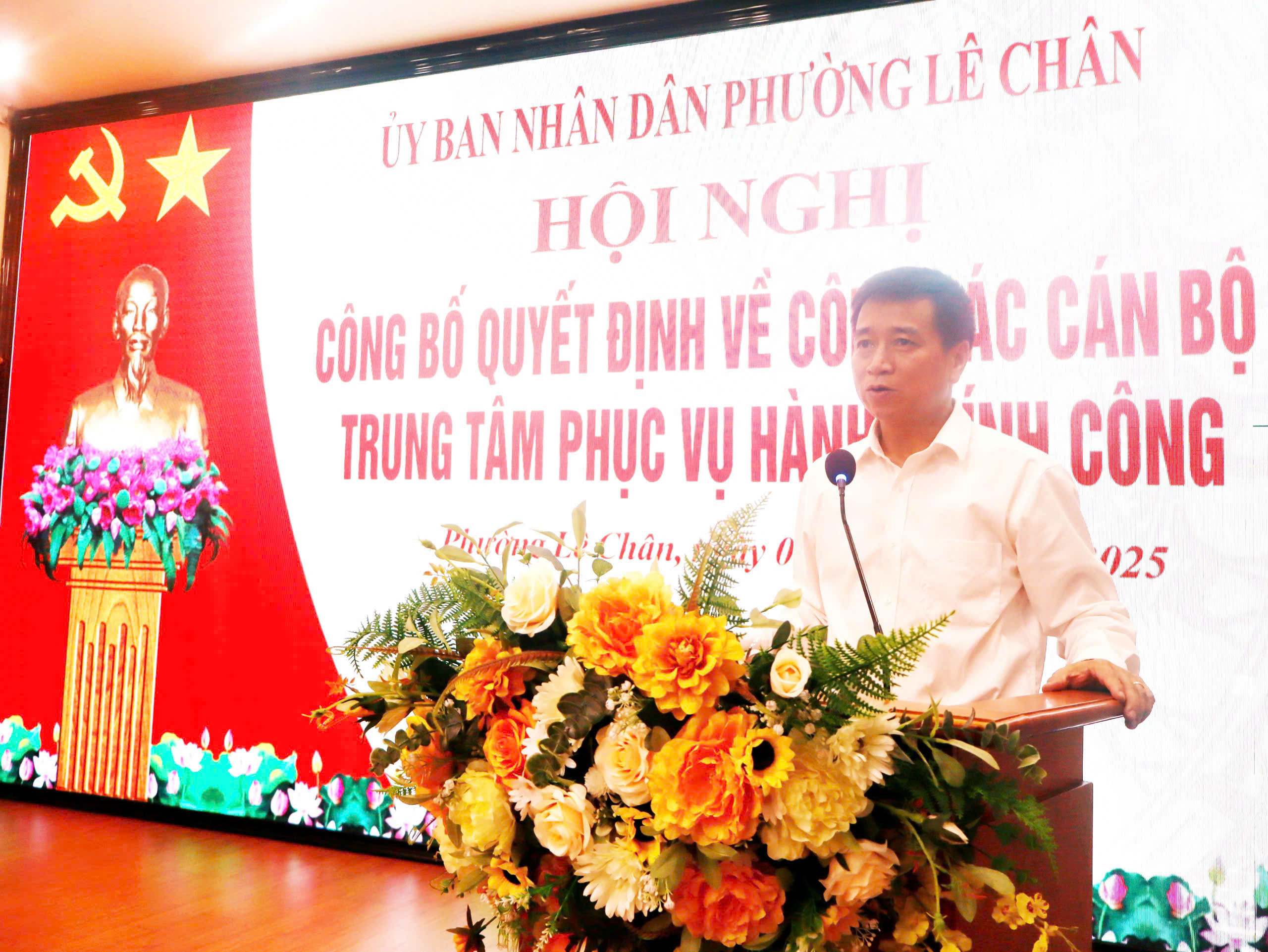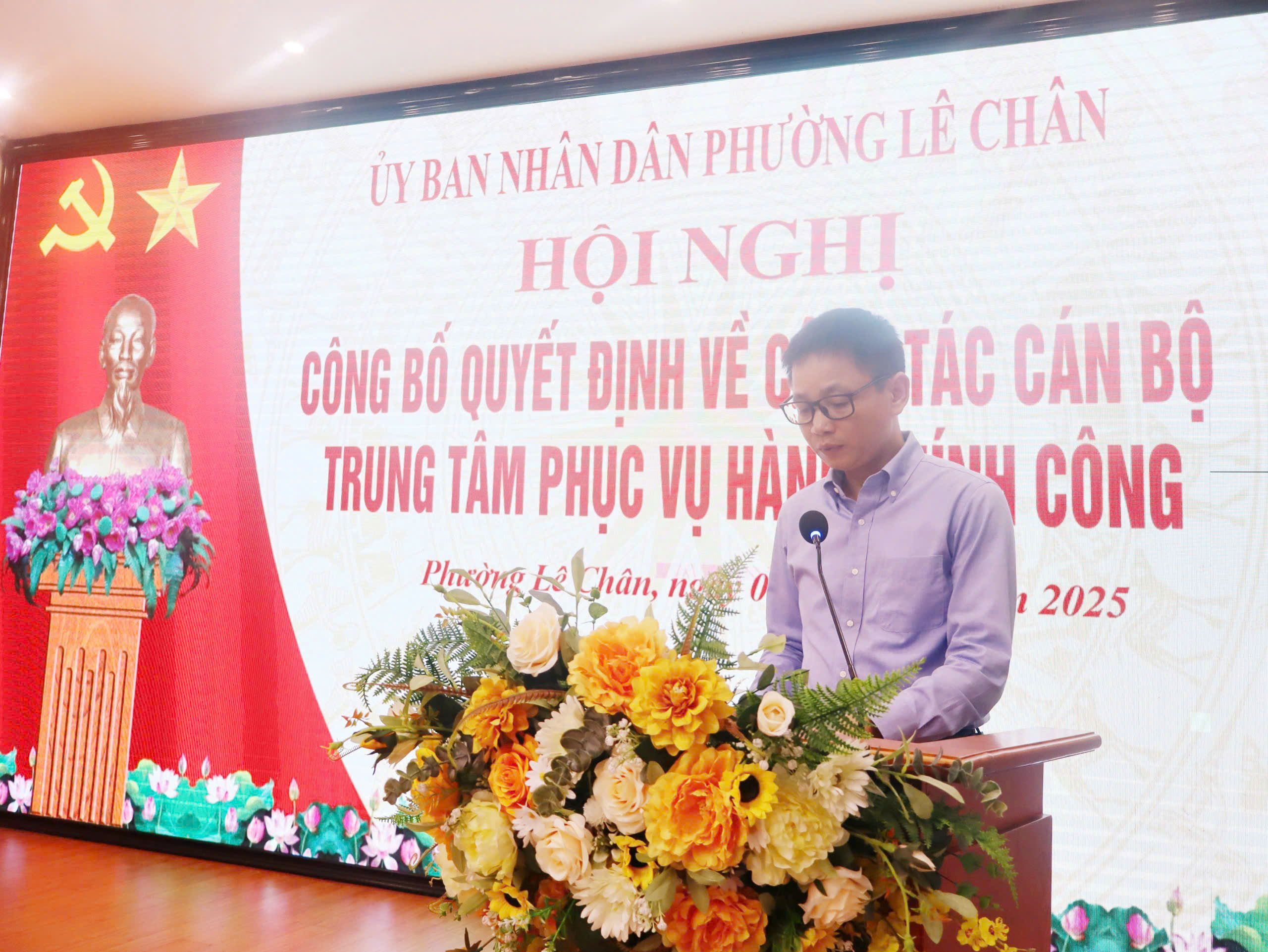 Chiều ngày 02/10/2025, tại Hội trường UBND phường, Ủy ban nhân dân phường Lê Chân tổ chức Hội nghị công bố Quyết định công tác cán bộ Trung tâm Phục vụ hành chính công.