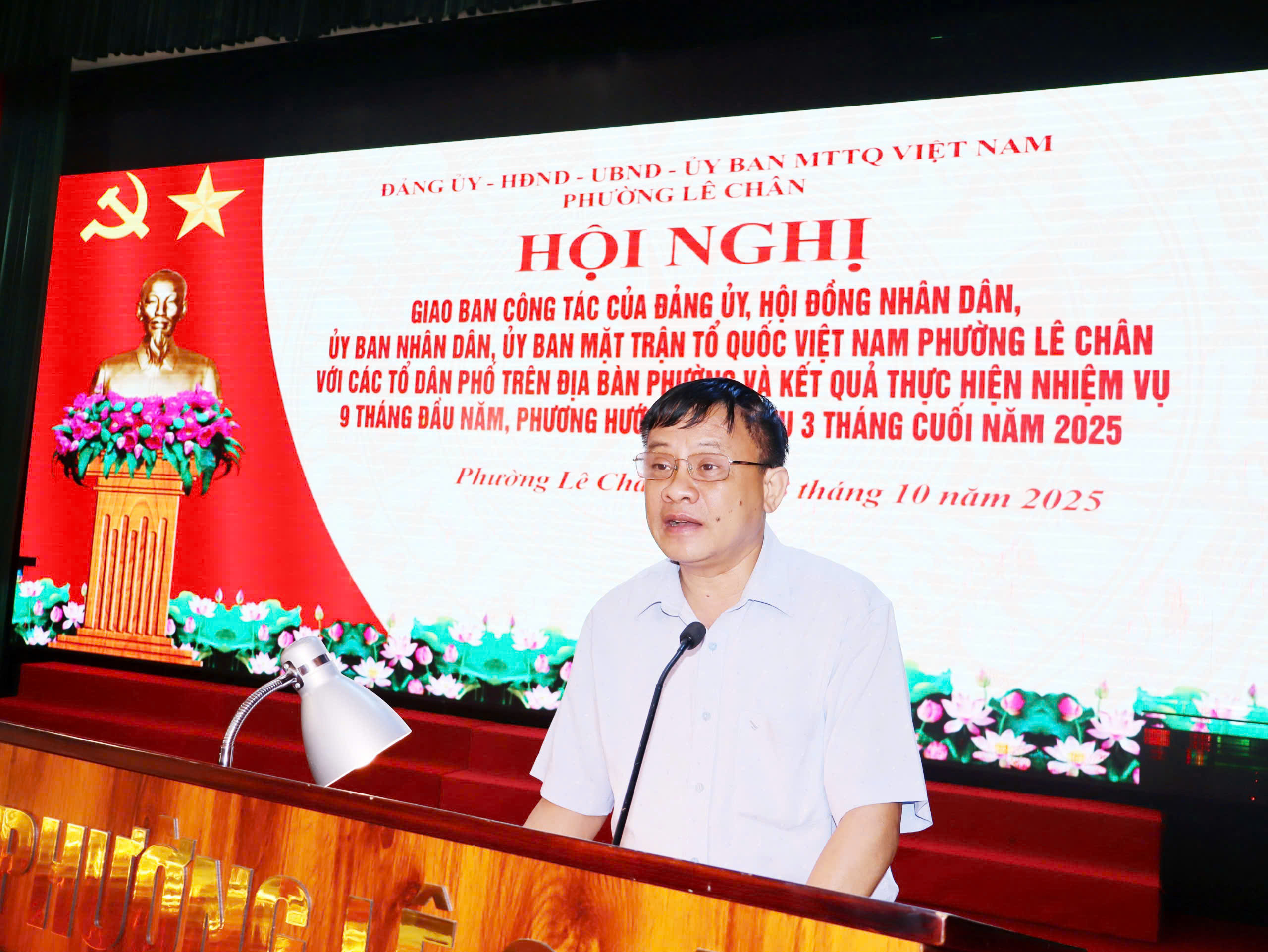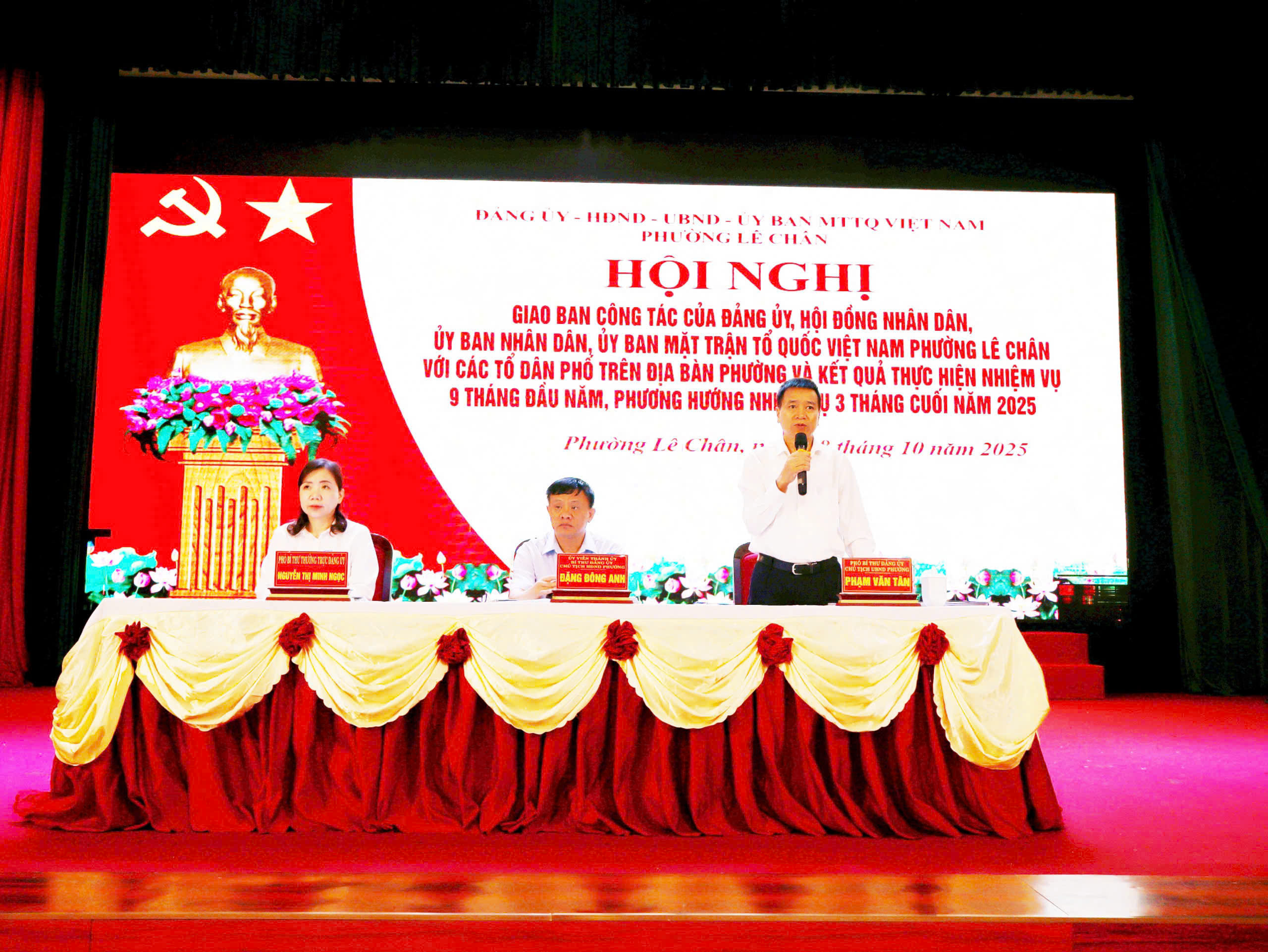 Chiều ngày 08/10/2025, tại Trung tâm Sự nghiệp công, Ủy ban nhân dân phường Lê Chân đã tổ chức Hội nghị giao ban giữa Đảng ủy, Hội đồng nhân dân, Ủy ban nhân dân, Ủy ban Mặt trận Tổ quốc Việt Nam phường với các tổ dân phố trên địa bàn.